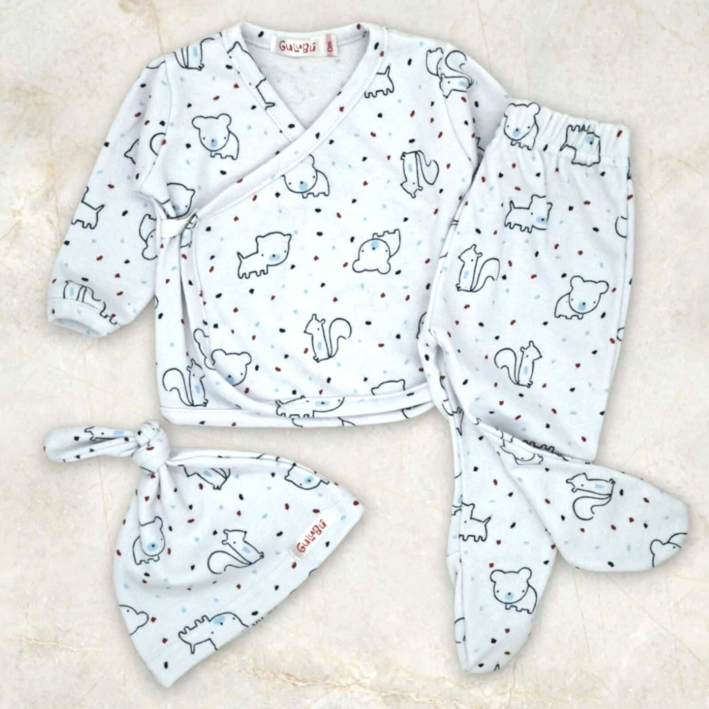 Este hermoso ajuar de nacimiento está confeccionado en interlock estampado , garantizando la suavidad y comodidad que tu bebé merece. El set incluye: